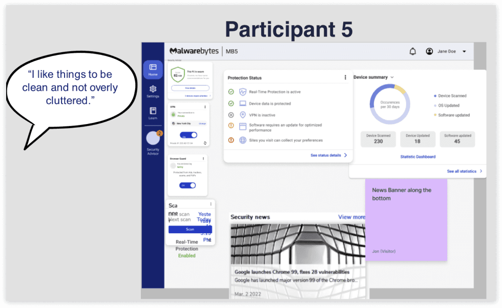 Participants also responded positively to a tone of voice that positioned the application as an approachable guide - rather than a passive monitoring tool - reinforcing the opportunity to present Malwarebytes as an ongoing personal security advisor.