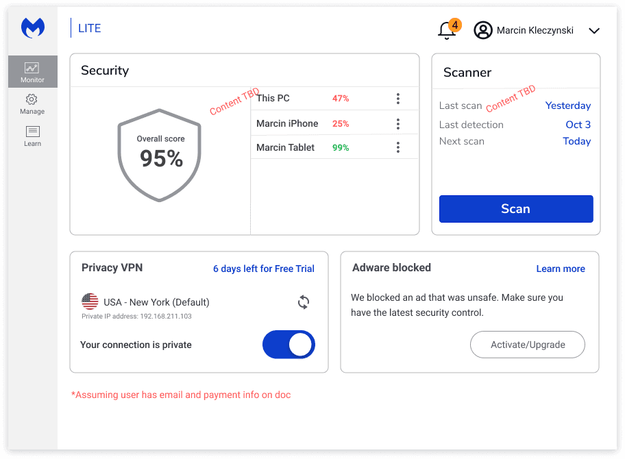 Although the North Star dashboard concept was not launched prior to my departure from Malwarebytes, the proposed architecture was adopted into the product roadmap and approved as the direction for the converged consumer platform.