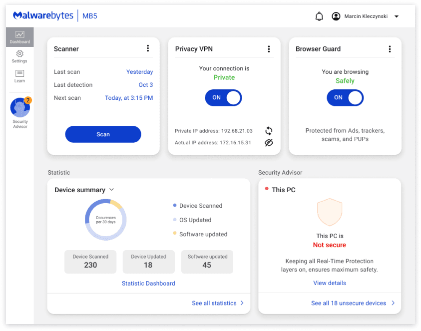 Malwarebytes’ shift toward bundled consumer offerings required more than feature integration, it demanded platform unification. I led the design transformation to evolve fragmented standalone products into a cohesive, extensible experience, defining the dashboard framework and modernization strategy that would support long-term scalability. In parallel, I guided a team of designers and aligned stakeholders across product and engineering to execute the transition.