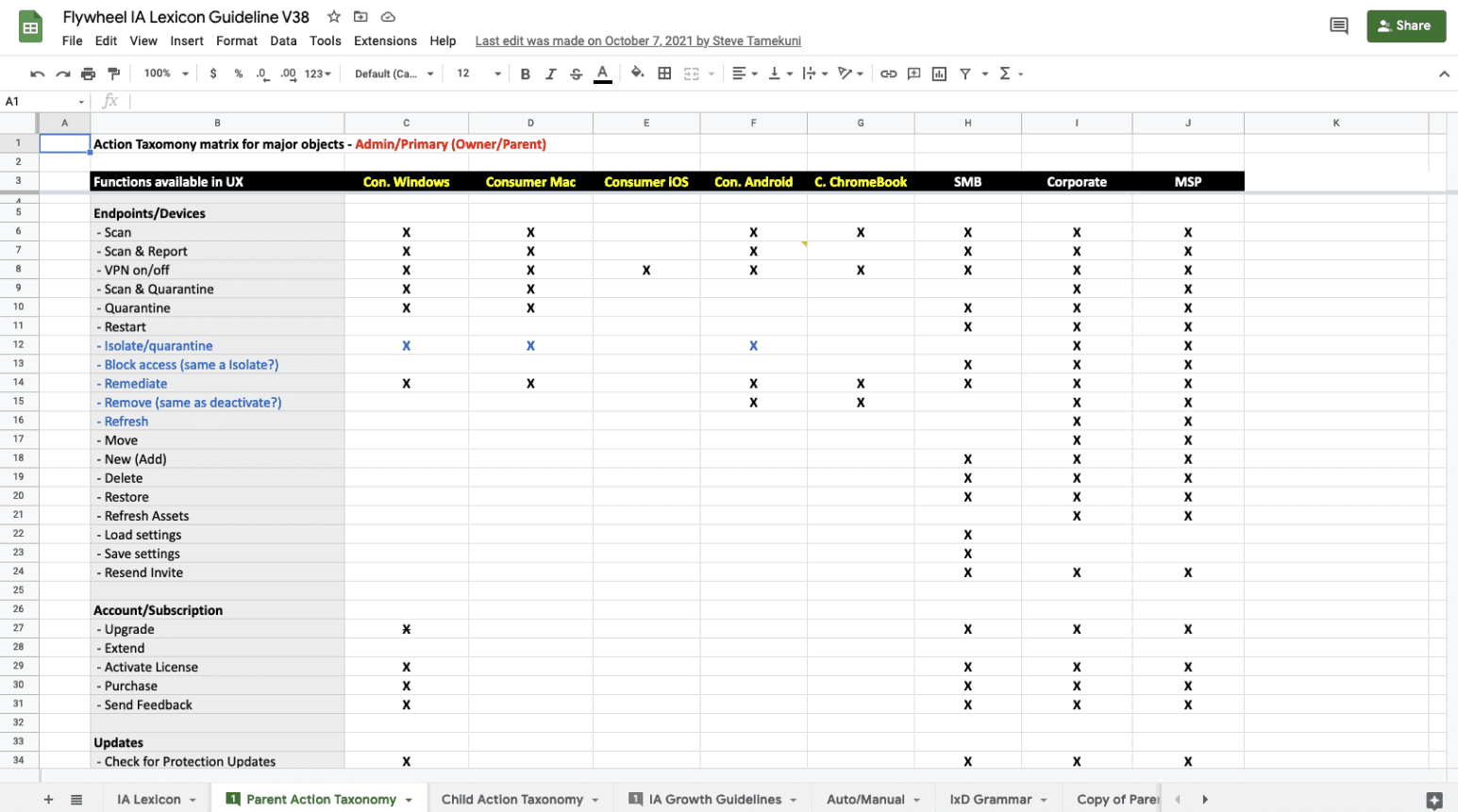 To establish a shared foundation, I led the creation of a master feature architecture that mapped functional overlap and clarified prioritization. A critical early decision was standardizing taxonomy. Some products framed functionality as objects (nouns), while others emphasized actions (verbs). To create consistency across the platform, we restructured features around actionable verbs — aligning the experience around what users could do, not just what existed.